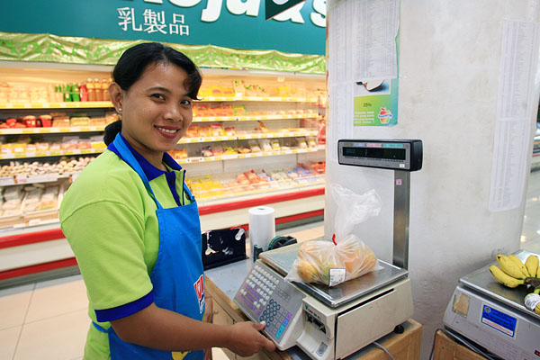 フリータクシーでデューティーフリーに。そしてマタハリデパートの果物売場。基本的に計量してもらいレジで支払います。 |