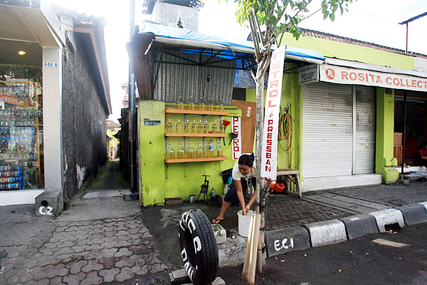 街のガゾリン屋パトロネールスタンド。もちろん普通のガソリンスタンドもあります。ここでは瓶に詰めて売っています。 |