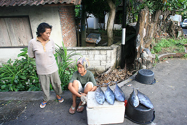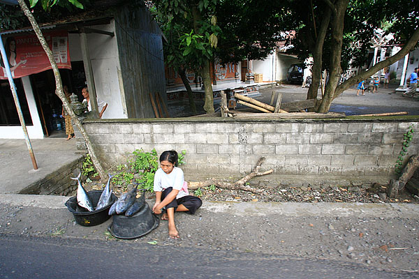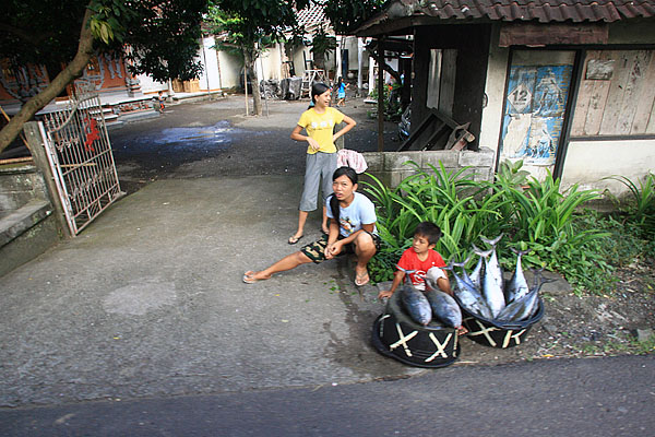 ![]() 道路沿いでは魚を売っている。 |